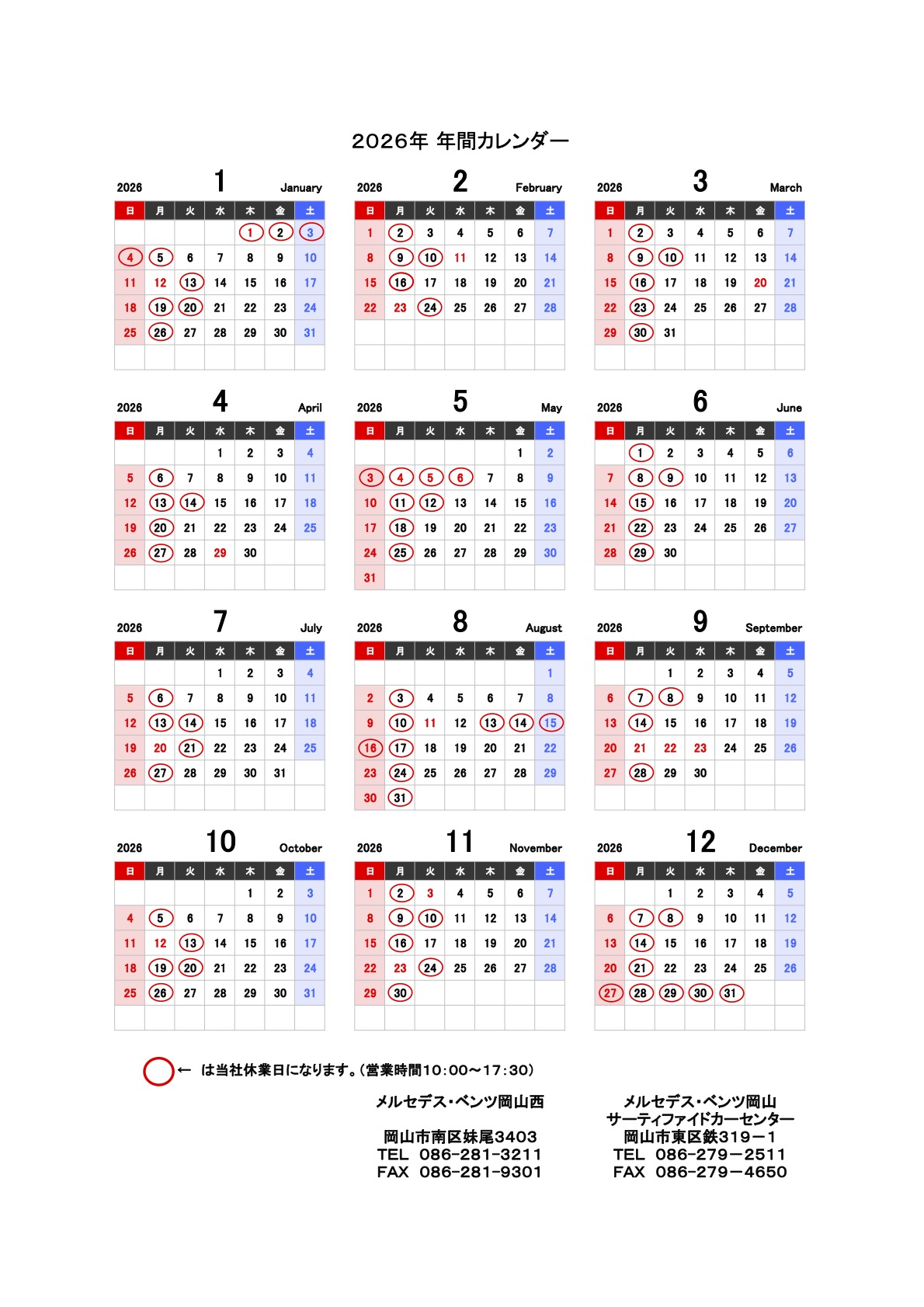 TOP 年間営業カレンダー